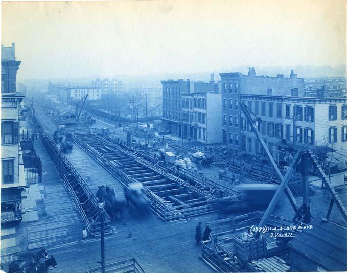 | Description: | Aerial view of a subway construction site on 4th Avenue between 36th Street and 37th Street. Image includes several residential buildings. |