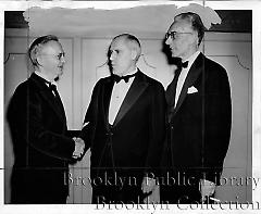 | Description: | Caption: "At 61st dinner--Caradoc C. Jones, chairman of the active membersw of the Apollo Club, greets the guest speaker, the Rev. Dr. William B. Pugh, at the club's 61st annual dinner. Alfred Boyce, conductor of the choral organization, looks on." |