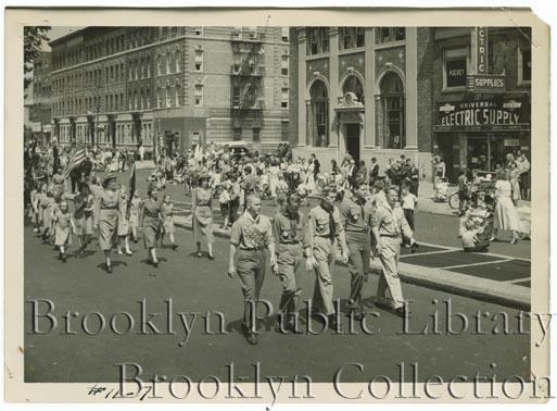 | Description: | One of fifteen images of parade on 4th Avenue between 51st and 52nd Streets; most images show bank building and electric supply store diagonally across street. Shows five Boy Scouts marching ahead of Girl Scouts. |