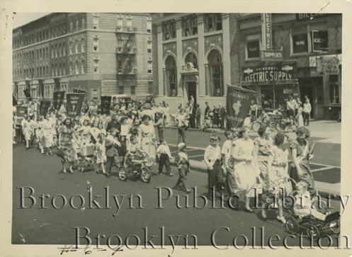 | Description: | Parade on 4th Avenue between 51st and 52nd Streets; most images show bank building and electric supply store diagonally across street; Shows procession of mothers and children; one boy dressed as cowboy. |