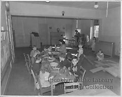| Description: | Interior view showing groups of children in Bay Ridge Day Nursery located at 44th Street and Third Avenue. At the time of cataloging, the neighborhood is Sunset Park. |