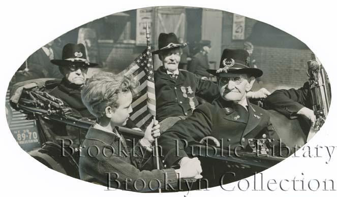 | Description: | Boy with American flag approaching an open car seating three Civil War veterans; location unknown. Caption on verso: "Bands, colorful uniforms and tributes to the veterans of American wars marked Memorial Day ceremonies in Brooklyn and Queens yesterday, with youth and the aged playing important roles in the pageantry. Above is Ronald Lent, 9, of 201 Weirfield St., shaking the hand of a member of another generation, Thomas Barker, 93-year-old Civil War veteran. In the rear of automobile are (left) Henry Stamm, 92, and John G. Soden, 91, two other vets of the war to preserve the Union." |