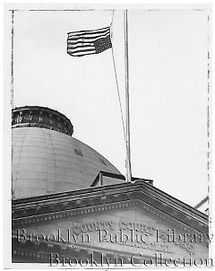| Description: | Close-up view of dome and pediment of Kings County Courthouse (subsequently demolished), with upside down American flag atop pediment. Caption: "Building in Distress: Although the flag atop the Supreme Court Building on Joralemon St. shows the signal for distress at sea this morning, it was all just a mistake. Attendant explained flag was soaking wet from yesterday's rain and rolled into a ball when he raised it today. He discovered the error about an hour later and flag flew correctly the rest of the day . . . " |
