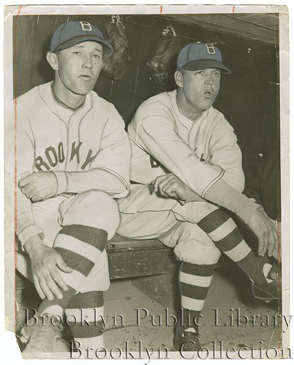 | Description: | Two former Brooklyn Dodgers, sitting in dugout, apparently when both had become managers or coaches; two baseball gloves hanging from wall behind them. |