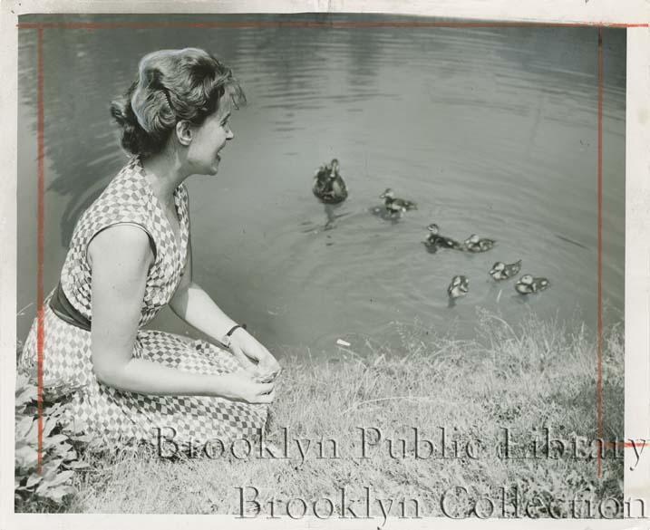 | Description: | Caption: "Call of the tame--Perched on shore of Oriental Garden lake at Brooklyn Botanic Garden,Joy Dueland of 163 Ocean Ave., watches promenade of wild duck family which has taken up residence there." |
