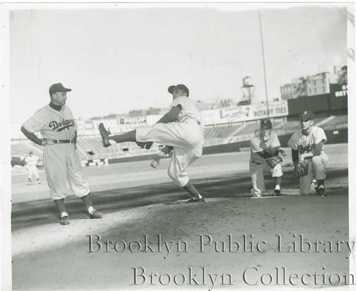 | Description: | Brooklyn Dodgers pitcher Carl Erskine in mid-delivery before World Series game at Yankee Stadium; two players at right and manager at left observing him; empty outfield seats in background. Inscription on verso: "Carl Erskine, Dodger probably starter, samples Yankee pitcher's mound. Chuck Dressen looks on as Russ Meyer & Clem Labine take note." |