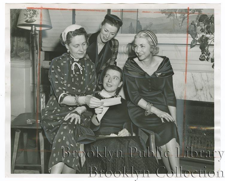 | Description: | Caption: "Committee convenes--Mrs. Edward P. Dunn, invitation chairman; Mrs. H. Robert Freund, floor committee chairman; Mrs. Charles W. Walseley, special prizes chairman (seated, left to right), and Mrs. William G. Mullin, prize chairman (standing center), were photographed at a meeting for the committee of the Long Island Hospital Guild bridge which will take place on Tuesday evening, May 4, at the Grand Ballroom of the Hotel St. George." |