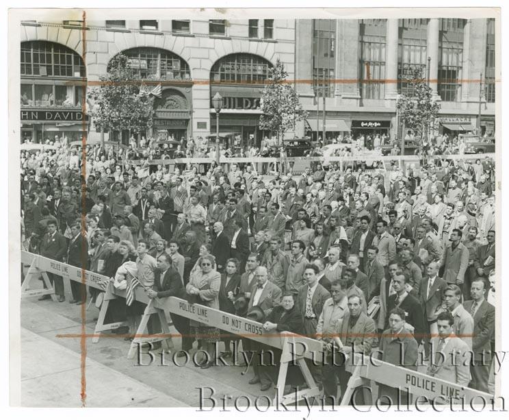 | Description: | Large crowd, some holding American flags, none cheering, gathered behind wooden barricades in Downtown Brooklyn; storefronts along Court Street in background. Caption: "Crowds gathered early at Borough Hall today to witness two events -- the Dodger motorcade and labor's day [sic] in Rededication Week." |