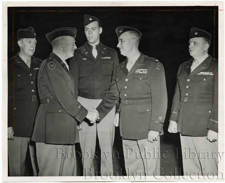 | Description: | Two soldiers shaking hands as three others look on during ceremony held at armory at 1322 Bedford Avenue in Crown Heights; background dark. Caption: "FEDERALIZED: Three battalions of the 106th Infantry, State Guard, were mustered into Federal service last night at the 23d Regiment Armory. Col. Lennox C. Brennan, retiring commander, second from left, is congratulated by Col. Clifford W. Butt, second from right, new commander of what is now a National Guard unit. In background are Lt. Col. Howard Decker, 1st Battalion, left; Lt. Col. Harry Tyler, 2d Battalion, center, and Maj. Clifford A. Hand, 3d Battalion, right." |