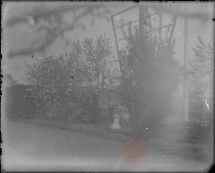 | Description: | Residential garden or yard with bushes, trees, trellis, flagpole and fence. |