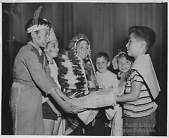 | Description: | Caption: "Golden jubilee pageant--Children of Hebrew Educational Society Community Play School, 563 Hopkinson Avenue, close play school season with a scene depicting progress since the Dutch bouth Manhattan from the Indians. Left to right are Norman Shea, Gloria Sperber and Stuart Williams as Indians, and Arnold Goluh, Libby Bruch and Melvin Berman as the Dutch." |