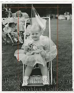 | Description: | Toddler with sash across chest sitting in baby carriage in Prospect Park as part of the annual Anniversary Day parade of the Brooklyn Sunday School Union; other children and bystanders in background. Caption on verso: "High Style: Elissa Bennett, 20 months, of St. John's Lutheran Church, wasn't up to walking so she picked a stroller to parade her ruffled party frock and new white shoes." |