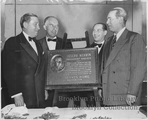 | Description: | Caption: "Honored for charitable services--Bronze plaque in tribute to Joseph Merrin, former president of the Infants Home of Brooklyn, is unveiled by Mayor O'Dwyer at a dinner in the Waldorf Astoria. Left to right, Mr. Merrin, Abner J. Rabbino, the home's new president, Monte Daniels, a vice president of the institution, and the mayor." |