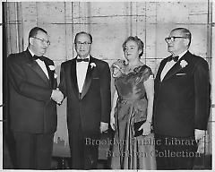 | Description: | Caption: "Job well done--Louis Blumenstock (left), president of the Warschauer Haym Salomon Home for the Aged, which is erecting a new $1,500,000 building on Cropsey Ave. and Bay 34th St., is shown felicitating Harry Gutschmidt, chairman of the annual dinner at the Hotel Commodore which added $50,000 to the new building fund. Mrs. Gutschmidt and Louis Barenstein, chairman of the board of directors, look on." |