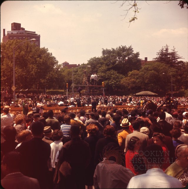 | Description: | Crowds gathered behind chairs and a camera crew on scaffolding, near the President John F. Kennedy Monument, in Grand Army Plaza. |