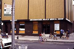 | Description: | View of the outside of the Knickerbocker Dekalb Medical Group building. There are several groups of people outside, including at least six children, two of whom are in strollers. In the foreground of the photo is a parking sign. |