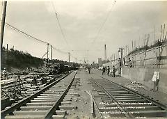 | Description: | View of construction site for subway line (the Sea Beach or N line) showing pedestrians at right standing next to unfinished tracks and platform; workers on tracks and scattered about site; freight cars and construction materials on and about tracks at left; embankment with utility poles at left; factory with smoke stack in right background. |