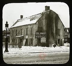 | Description: | Exterior view of a historic house at 624 Flatbush Avenue with one side covered in bare vine and the roof dusted with snow. The signs affixed to the house read "General Jobbing Co.," and "Thomas F. Fee Carpenter & Contractor." The snow covered sidewalk, a gas street lamp, and the empty cobblestone street with a trolly track are in the forefront. (Murphy House. Flatbush Avenue + Chester Ct. - Dr. Ralph I. Lloyd) [handwritten on recto]. |