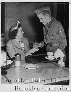 | Description: | Caption: "This one's on junior--Boy Scout James Fisher, 12, Troop 45, treats his mom, Mrs. Chester Fisher of 1134 Nostrand Ave., to breakfast at Garfield Cafeteria as part of Mother's Day celebration by the troop.The breakfast followed a special Mother's Day communion at Holy Cross Church." |
