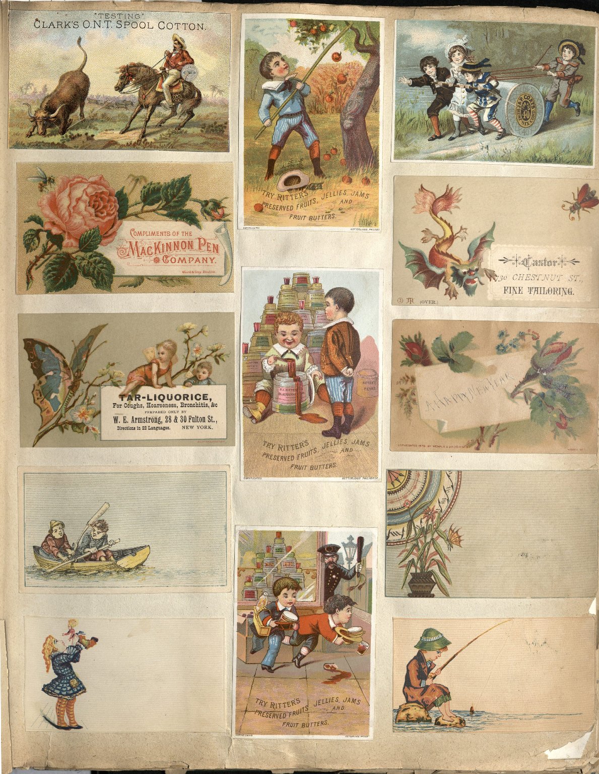 Scrapbook of trade cards, 1878-1885. 1878-1885 [1878-1885]. 1 v. ([86] p.) ; mounted cards ; 38 x 31 cm. |
