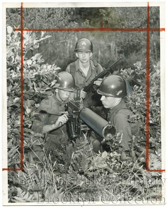 | Description: | Three soldiers with machine gun and rifle in field with dense vegetation. Caption on verso: "PINE CAMP DRILL: As part of Brooklyn's 106th Infantry Regiment annual field training at Pine Camp, N. Y. [later known as Fort Drum], three borough boys demonstrate the fineries of a 30-caliber machine gun. Left to right are Cpl. Joseph Bellow of 161 68th St., Sgt. Donald Latridis of 212 Autumn Ave. and Pvt. Joseph Koch of 7101 Colonial Road." |