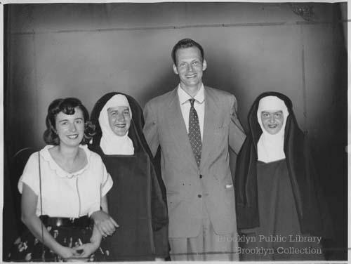 | Description: | Caption: "Principals in play--This quartet figured in the summer dramatization at the workshop of St. John's University Teachers College last week in the DeGray Auditorium of the school. It was entitled 'The Song at the Scaffold.' Left to right are Dorothy Haile, who played the leading role, Barbara Bruschi, Arthur Davis, workshop director, and Maureen Quinn;" two of the students are wearing nuns' habits. |