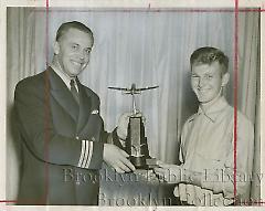 | Description: | Adolescent boy receiving trophy from pilot, presumably at Abraham & Straus department store on Fulton Street; curtain behind them. Caption: "PRIZE PLANE: Captain 'Cree' Stelling, Eastern Air Lines check pilot and former All-American football star, awards a Captain Eddie Rickenbacker silver trophy to John Walsh, 19, of St. James, L.I., for his prize-winning model plane entered in the Abraham & Straus Speedee-Bilt Model Plane Building Contest." |