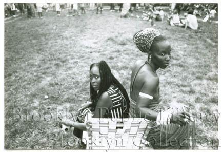 | Description: | Close-up, exterior view of two young African American women sitting, back to back, on a folding chair in Prospect Park. |