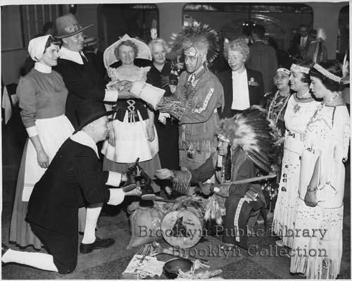 | Description: | Caption: "Re-enact purchase of Coney Island from Indians--The purchase of Coney Island by the Dutch from the Indians is re-enacted at a luncheon celebrating the 300th anniversary of the event at Garguilo's Restaurant, W. 15th St. and Mermaid Ave. Oscar Schneider and George L. Right and John McDonald as Jo WIlson hand over two guns and three pounds of 'gunpowder' with Jules One Arrow and Chief Earl Two Bears as the Indians, as part of the purchase price for the land. At the right is Mrs. Tracy S. Voorhees, wife of the former Undersecretary of the Army, whose ancestor Stephen voorhees was clerk of the old town of Gravesend and who signed the originan purchse document." |