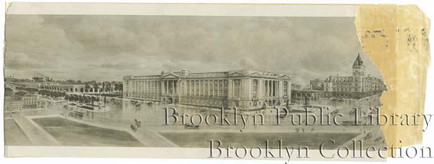 | Description: | Architectural rendering of improved plaza and proposed neoclassical courthouse in downtown Brooklyn, no longer extent, if ever built. Caption on verso: "Brooklyn Courthouse, as designed under the direction of Bridge Commissioner O'Keefe. This shows how the Brooklyn Bridge Plaza might be made into an ideal civic center. . . . By building the courthouse on this site it would be possible to create a dignified approach to the Brooklyn end of the Brooklyn Bridge. . . ." |