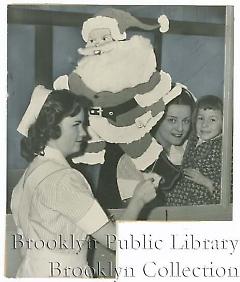 | Description: | Caption: "Santa's helper--Edith Turner, left, 19-year-old student nurse, puts the finishing touches on Santa Claus' boot at the Broklyn Hospital while Maria Strano, another student nurse, holds Diane Shirley Levy, 4-year-old patient. The billowy Santa Claus with his dashing pose is the result of free-hand art work done by students on the glass cubicles in the Pediatric Ward." |