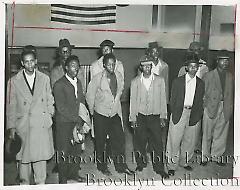 | Description: | Caption: "Seized in gang war--These [eleven African American] teenagers were among 18 youths booked at the Liberty Ave. precinct after a gang feud broke out in Brownsville. Three were wounded and there was a street free-for-all in the warfare between the 'Saints' and the "Socialistic Gents'." |