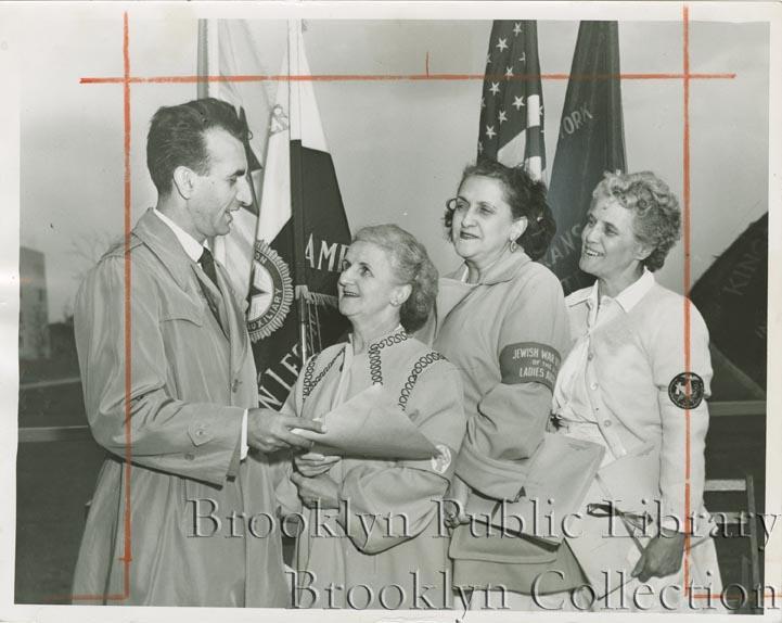 | Description: | Caption:"For services rendered--Albert L. Addeo, director of volunteers at tthe Brooklyn Veterans Hospital [i.e. Fort Hamilton Veterans Hospital], presents merit and appreciation certificates to representatives of various voluntary organizations who served the hospital on a regularly scheduled baeis. The representatives, left to right, are Anna E. Gorman of the Catholic War Veterans Auxiliary, Sylvia Gober of the Jewish War Veterans Auxiliary, and Bertha Olsen of Order of the Eastern Star." |