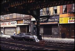 | Description: | Street view underneath the elevated train. The photo shows storefronts with the following signs: "...Bargains Kent", "Young Folks: Togs for Tots", "...Shoes, Inc.", "...Notions, Buttons, Trimming, Zippers, Elastic, Bridal, Satins, Laces, Veilings, Beading...". Every store has its metal shutters drawn. We also see the supports for the elevated train, a parked car, and a few pedestrians. |