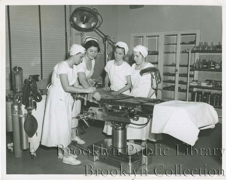 | Description: | Caption: "Study new gadgets: Members of the nursing staff check fixtures on the new operating table, the latest type, presented to the Caledonian Hospital of Brooklyn by the Women's Society. The new $1,500 table is the most recent gift of the Women's Society which has presented a total of $75,000 to the hospital since it was chartered 40 years ago as the only voluntary hospital in the United States organized and sponsored by a group of Scottish-American[s]. The Women's Society is sponsoring a benefit bridge in the Nurses'Residence, Wednesday, February 21. Left to right - Eugina Powers, Alina Perticari, Terry O'Hara, Mary Geraci. From Caledonian Hospital of Brooklyn, 132 Parkside Avenue." |