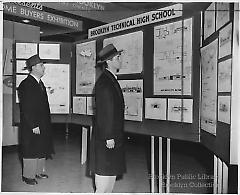 | Description: | Caption: "Tech exhibit--Romeo Falco, left, of 1760 E. 37th St. and Anthony Casazza of 260 E. 25th St., prospective home owners, look over an exhibit of the work of architecural students of Brooklyn Technical High School [located at 29 Fort Greene Place]. The exhibit will be open today and tomorrow in the lobby of the Dime Savings Bank, Fulton St. and DeKalb Ave." |