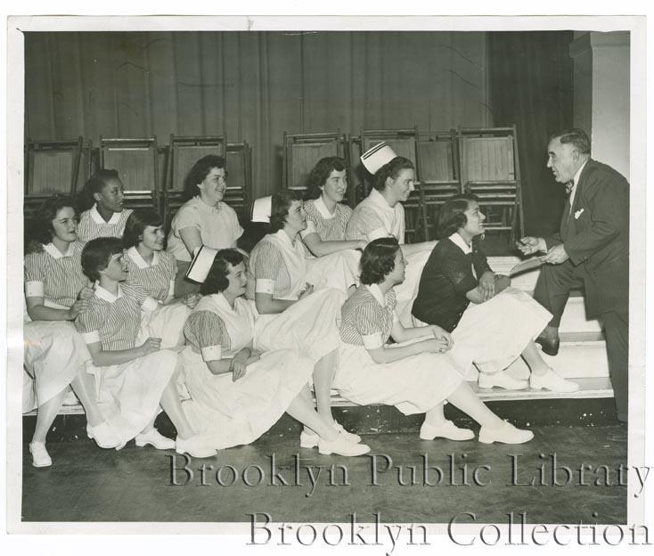 | Description: | Caption: "Tex the tutor--Student nurses at St. Mary's Hospital listen attentively as Tex Rickard explains their parts for the forthcoming variety show. Rickard is donating his services to help the girls raise money for their recreation room." |