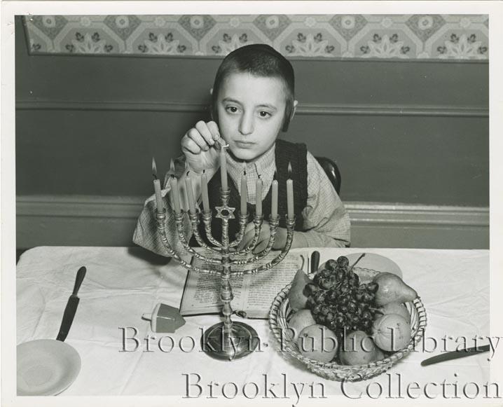 | Description: | Caption: "Thomas Bretter, 8, son of Mr. and Mrs.Bela Bretter, 160 Ross St., Brooklyn, lights the first candle of the Menorah to begin his first Chanukah in this country. The Bretter family arrived in the United States earlyl this year and have been helped to integrate themselves in the American way of life by the New York Association for New Americans, a constituent agency of the United Jewish Appeal. Chanukah, of the Festival of lights, celebrates the rededication of the Temple by the victorious Maccabees (167 B.C.E.) in their struggle against the Syrian King Antiochus who had attempted to suppress Judiasm." The same typed caption is on the versos of both images. This image is not dated. |