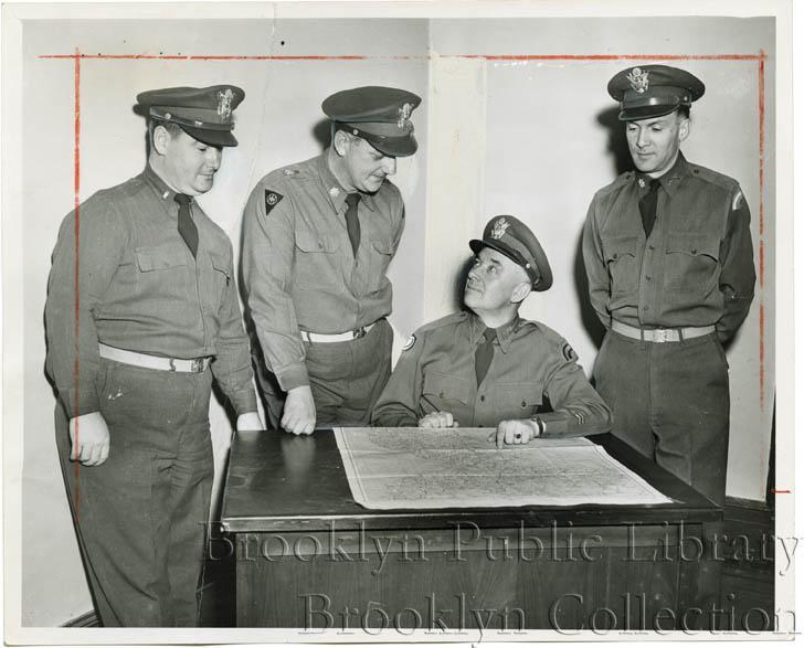 | Description: | Four military officers (three standing, one seated) conferring over map spread out on desk, probably in armory at 1322 Bedford Avenue in Crown Heights. Caption: "TOP BRASS: Brooklyn's largest National Guard unit, in addition to weekly drill sessions in the armory, is administered a solid dose of firing range training during the Spring at Camp Smith, near Peekskill. Mapping plans for the first 'weekend shoot' of 1952 are, left to right, George F. Kennedy of 62 Newell St., Maj. Christopher D. Doyle of 1067 E. 2d St., Col. C. W. Butt of Newburgh, commanding officer of the 106th, and Maj. Harry Farrell of 695 Anderson Ave., Franklin Square." |