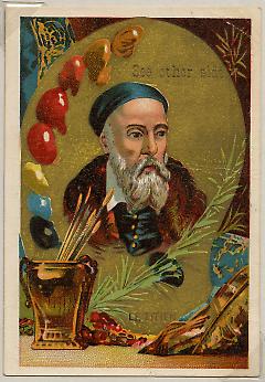 | Description: | Colorful illustration of a man's bust in the center of a painter's palette. Metallic gold background. Text reads: See other side. Titien. |