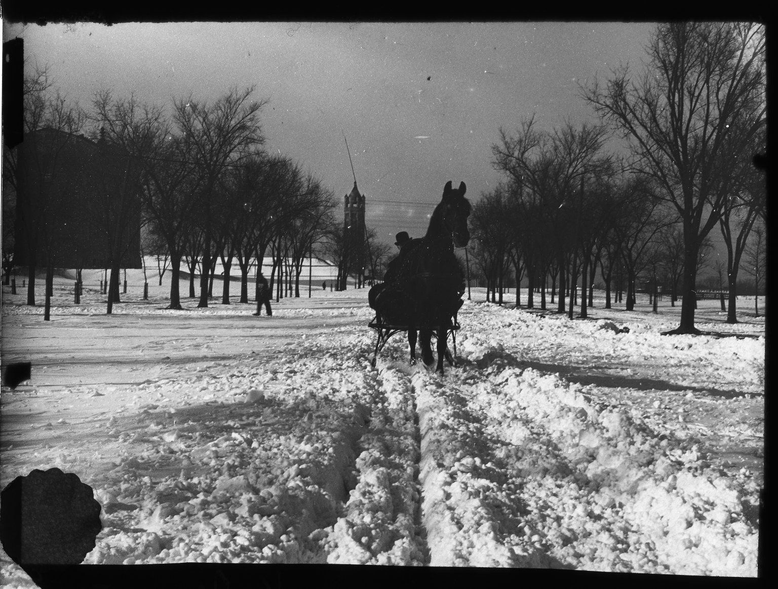 Views: Brooklyn, Long Island, Staten Island. Brooklyn scenes; buildings. View 003: Eastern Parkway (streetscape, man on horse-drawn carriage in snow).