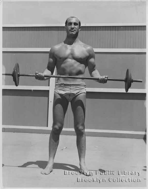 Young man at Coney Island beach wearing bathing suit lifting barbell with both hands.